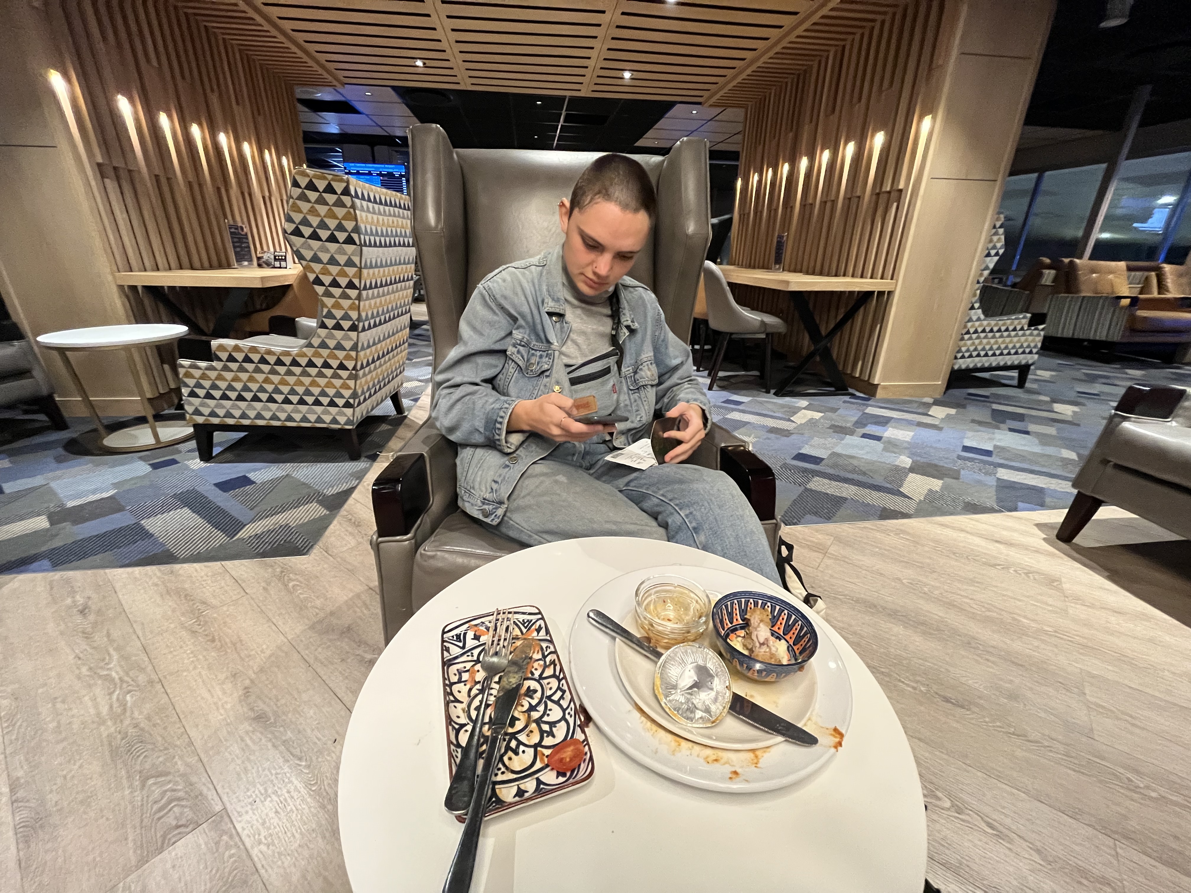 We cruise around the deserted airport looking for a restaurant. After a full loop we decide to go to the lounge that Jordan can get into for free. I decide to use some of my Splitwise credit to buy my entry.