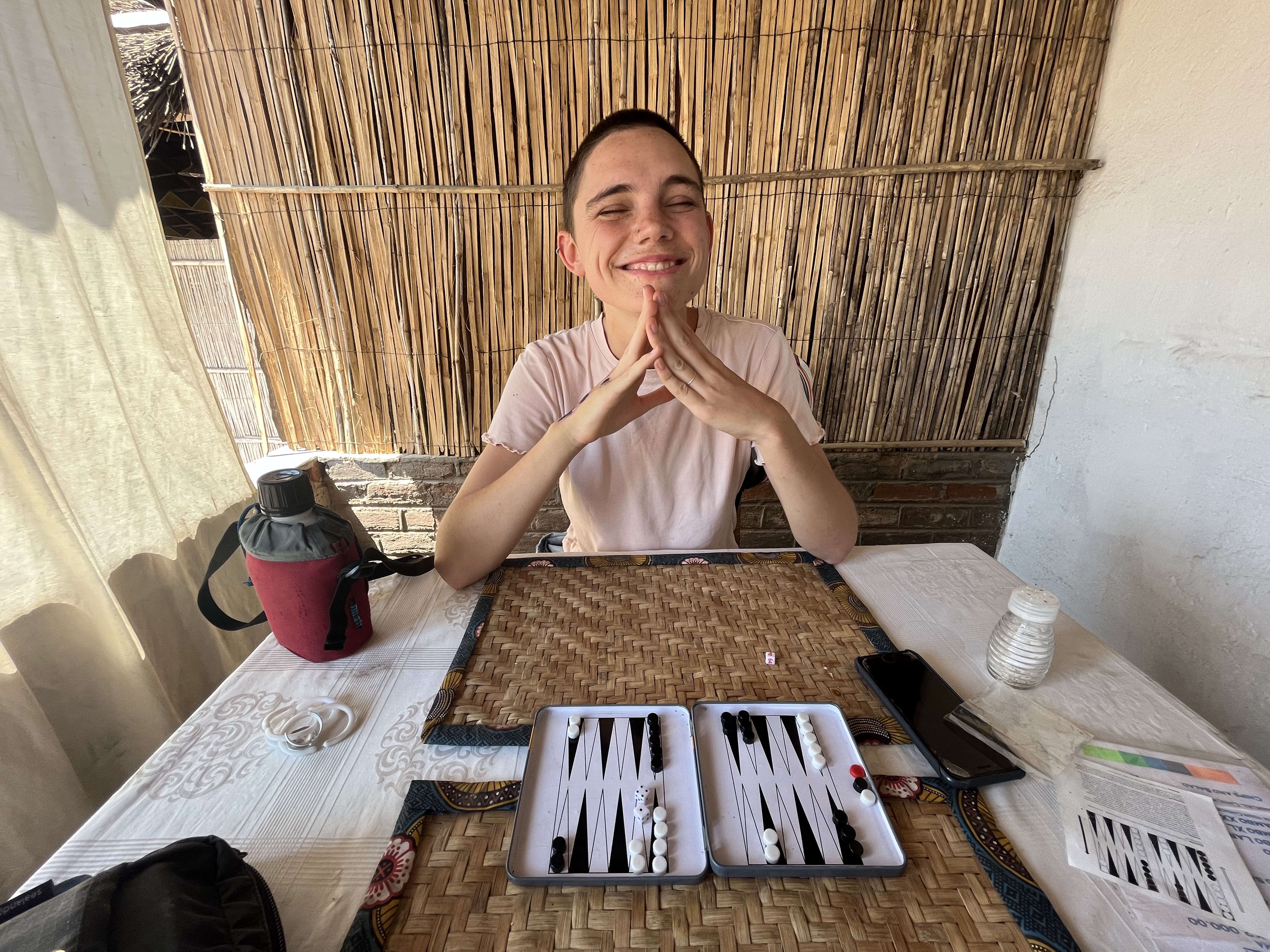 We play another game of backgammon and it seems one sided until Jordan makes a miracle comeback. We pause the game for dinner which is curried fish - my new favourite, kampango - and rice. Jordan has samoosas with salad that is also excellent. We resume the game but Jordan’s luck is not enough. 3 -1.