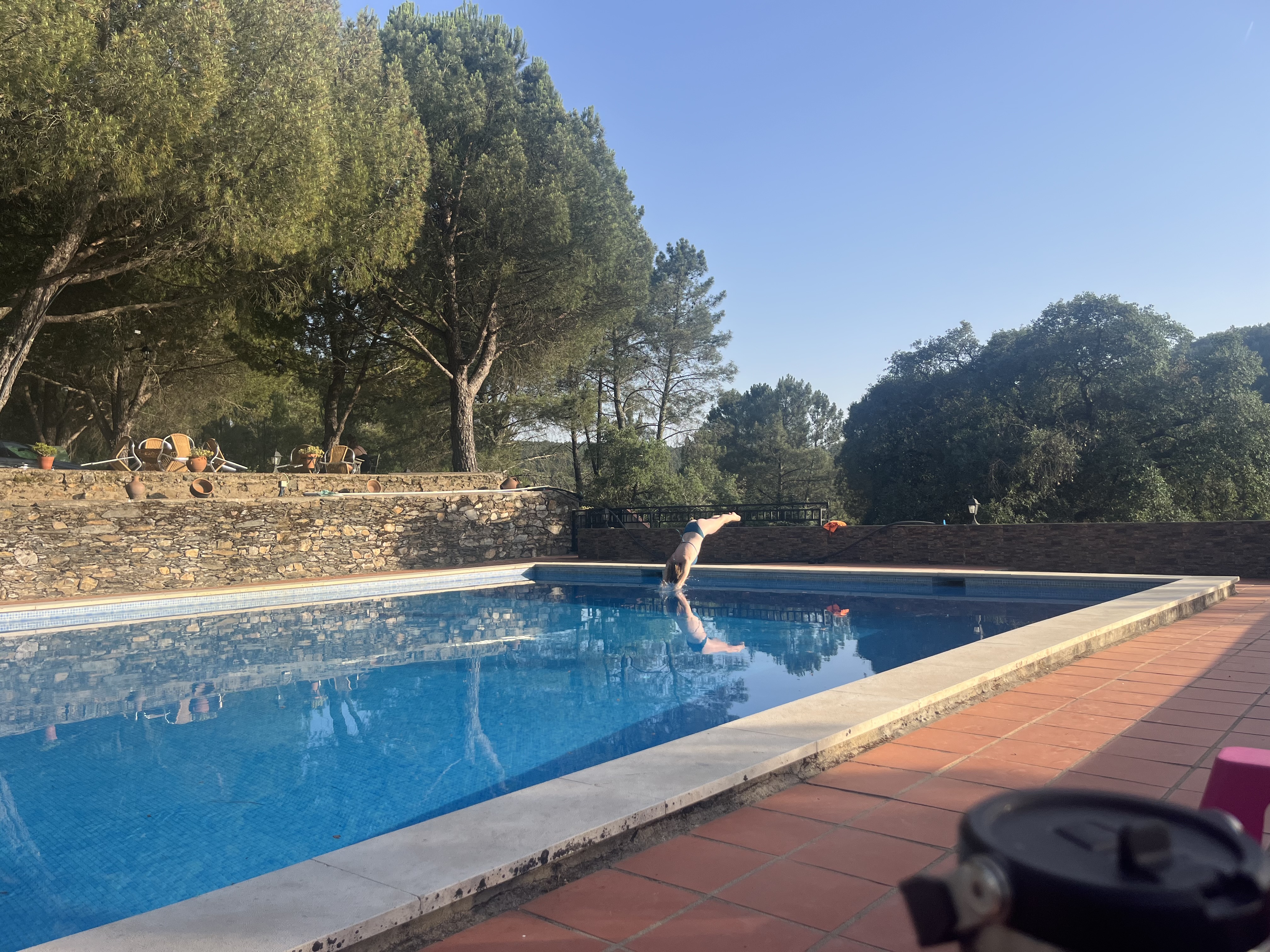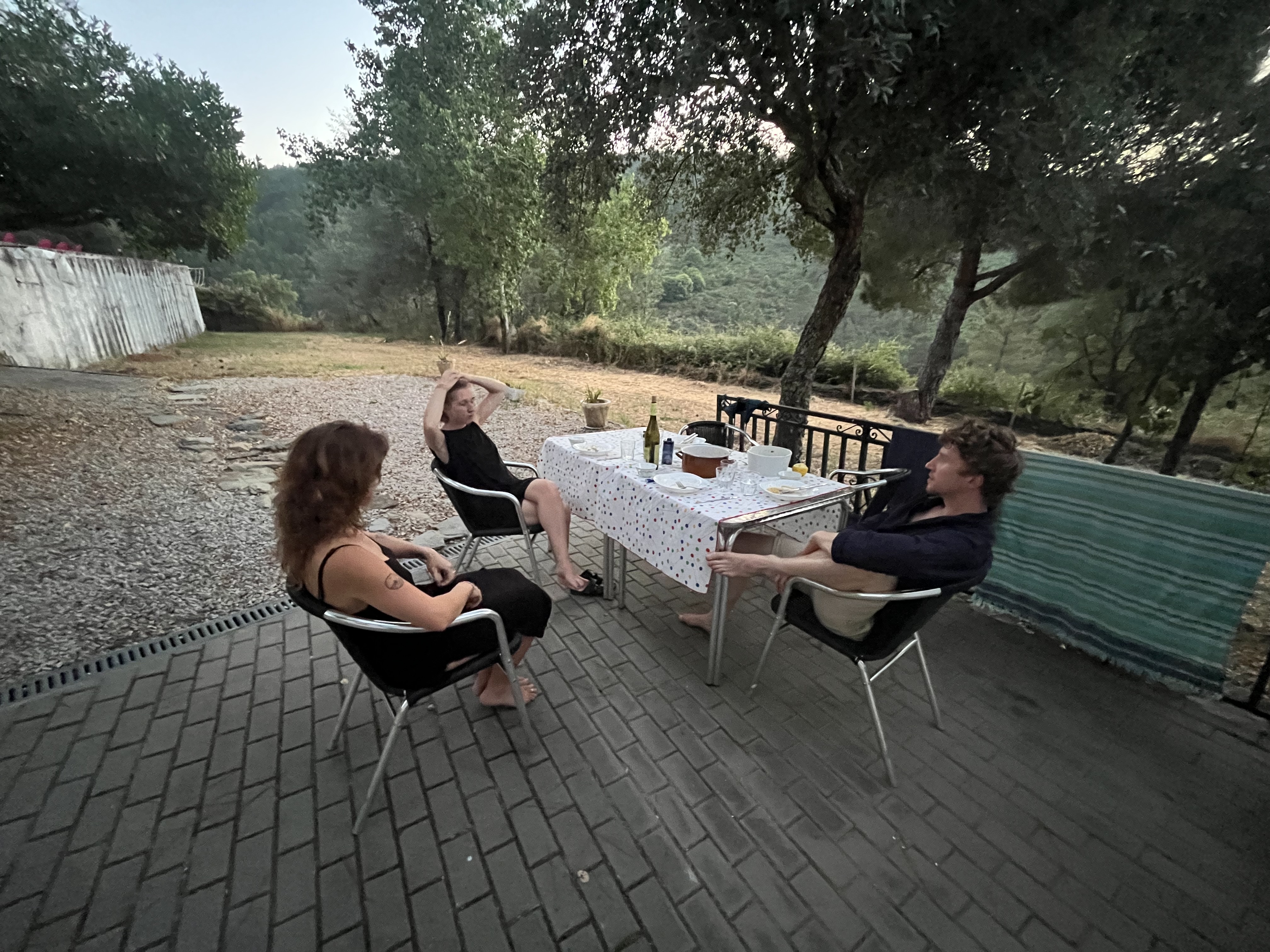 Marvão: the night before Waking Life. A sick night for me as I picked up a flu. Hot with a capital “H”, luckily complimented by a pool. A magical pasta dinner outside in the late evening light (9:30pm). A leaf blower to compliment the sunset.
