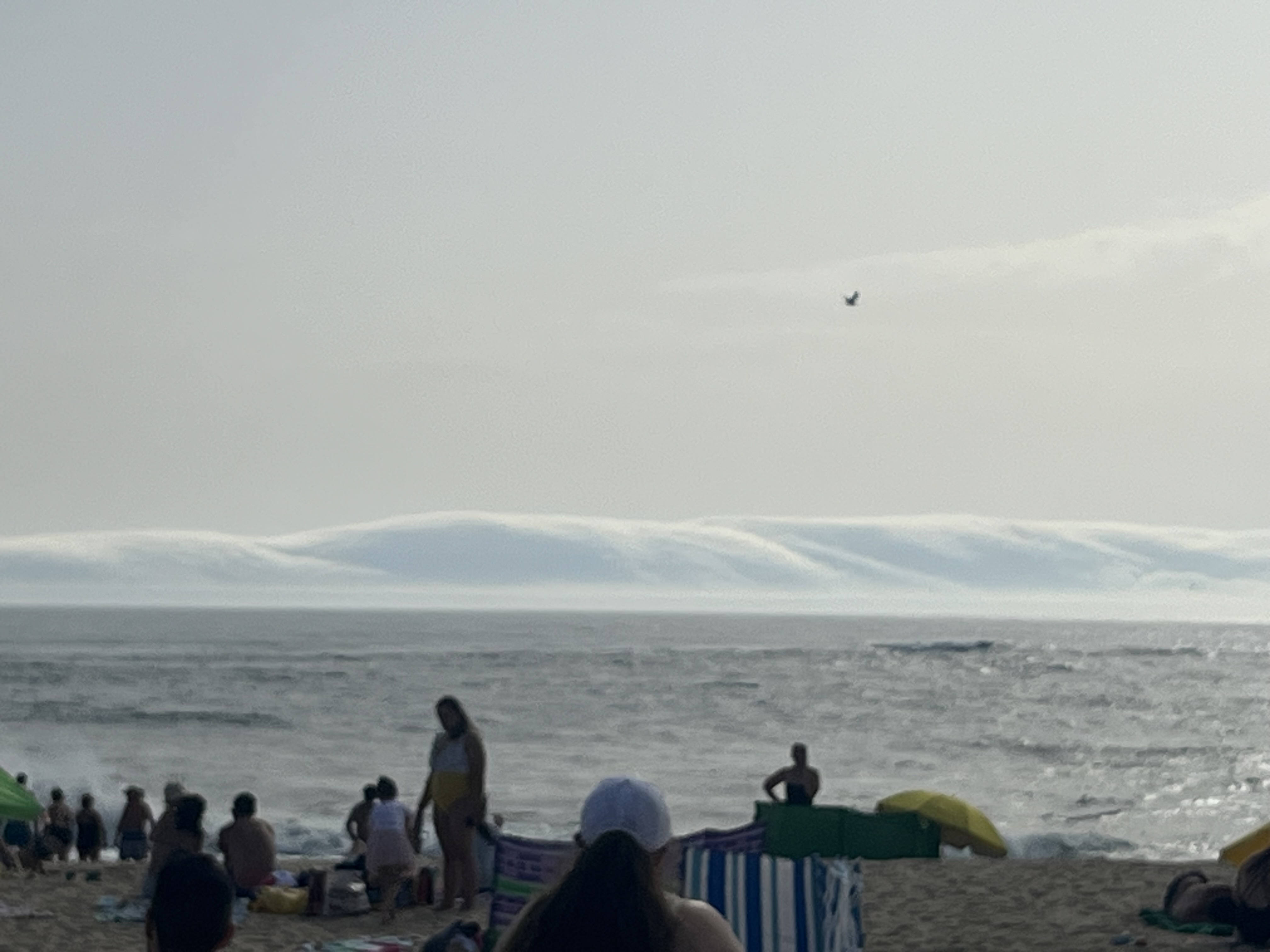 A massive cloud bank forms on the horizon over the ocean. They come across like an enormous range of snowy mountains, ominous. Thunder or fireworks in the distance.