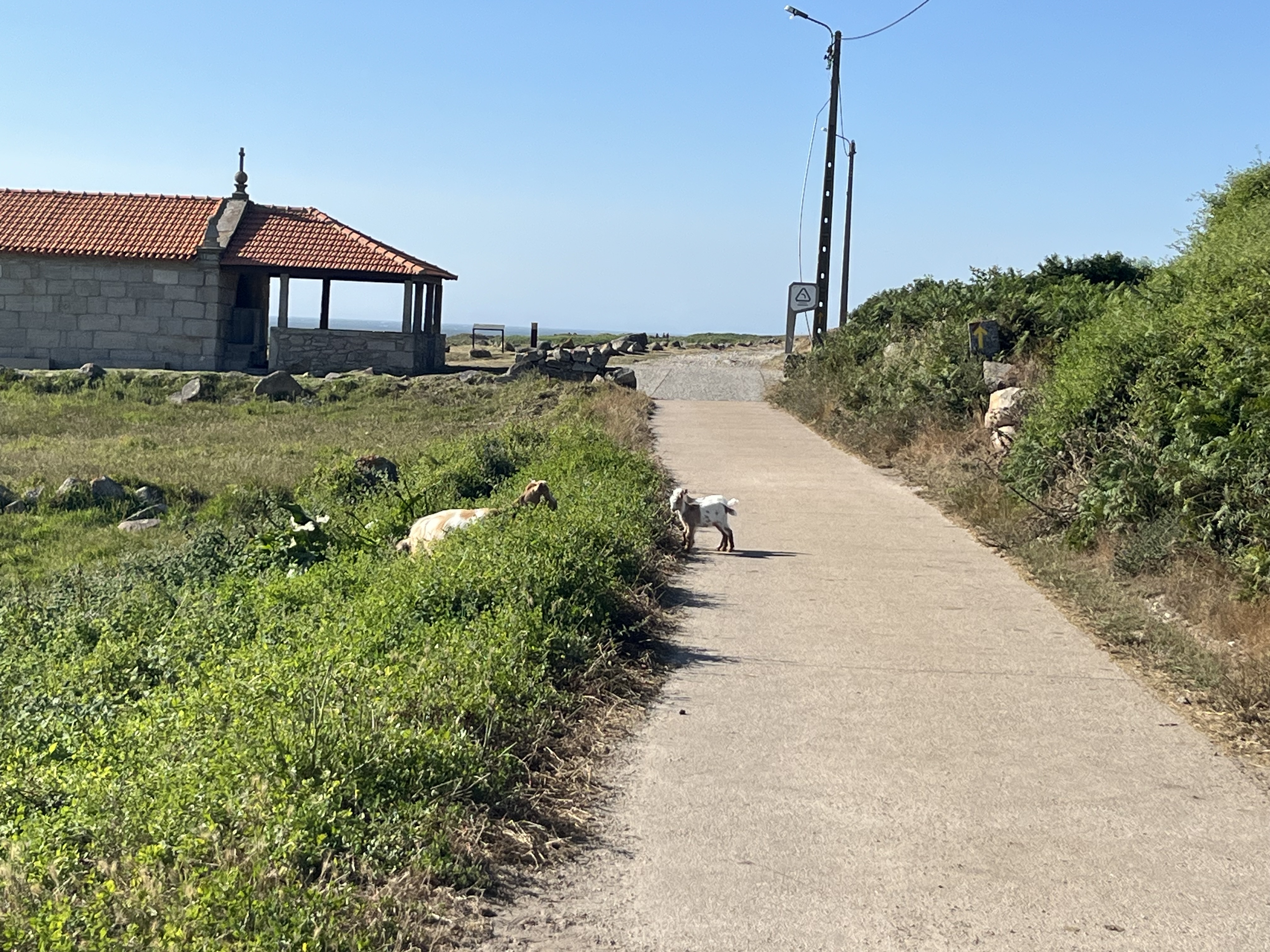 We start of the walk is beautiful: a coastal meander down Portugals great coastal infrastructure. There are goats with their kids being incredibly cute with their weird bouncy way of moving. Yet after about 5km I start to flag a bit with the heavy pack. I wonder if I would be able to send it back to Lisbon, then only hike with Cait’s pack and my small fast pack. We look at a couple luggage couriers while we sit under a train bridge.