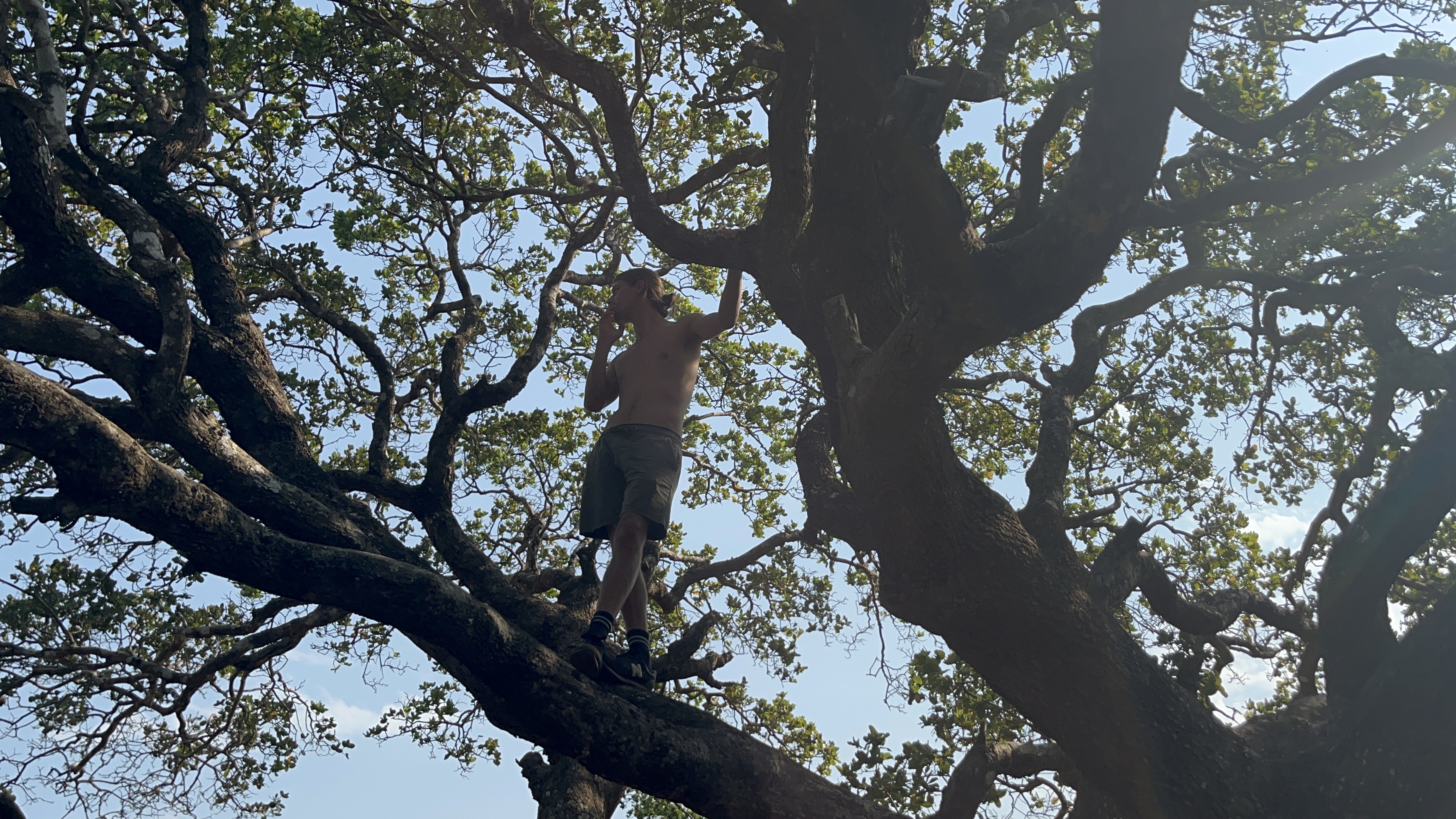Campsite 17 is the better one: a beautiful big tree that offers mottled shade wherever the sun might be, soft sand and the feeling of solitude that we’ve grown accustomed to. Julian attempts a hammock setting operation that risks life and limb. He concedes with two lower branches.