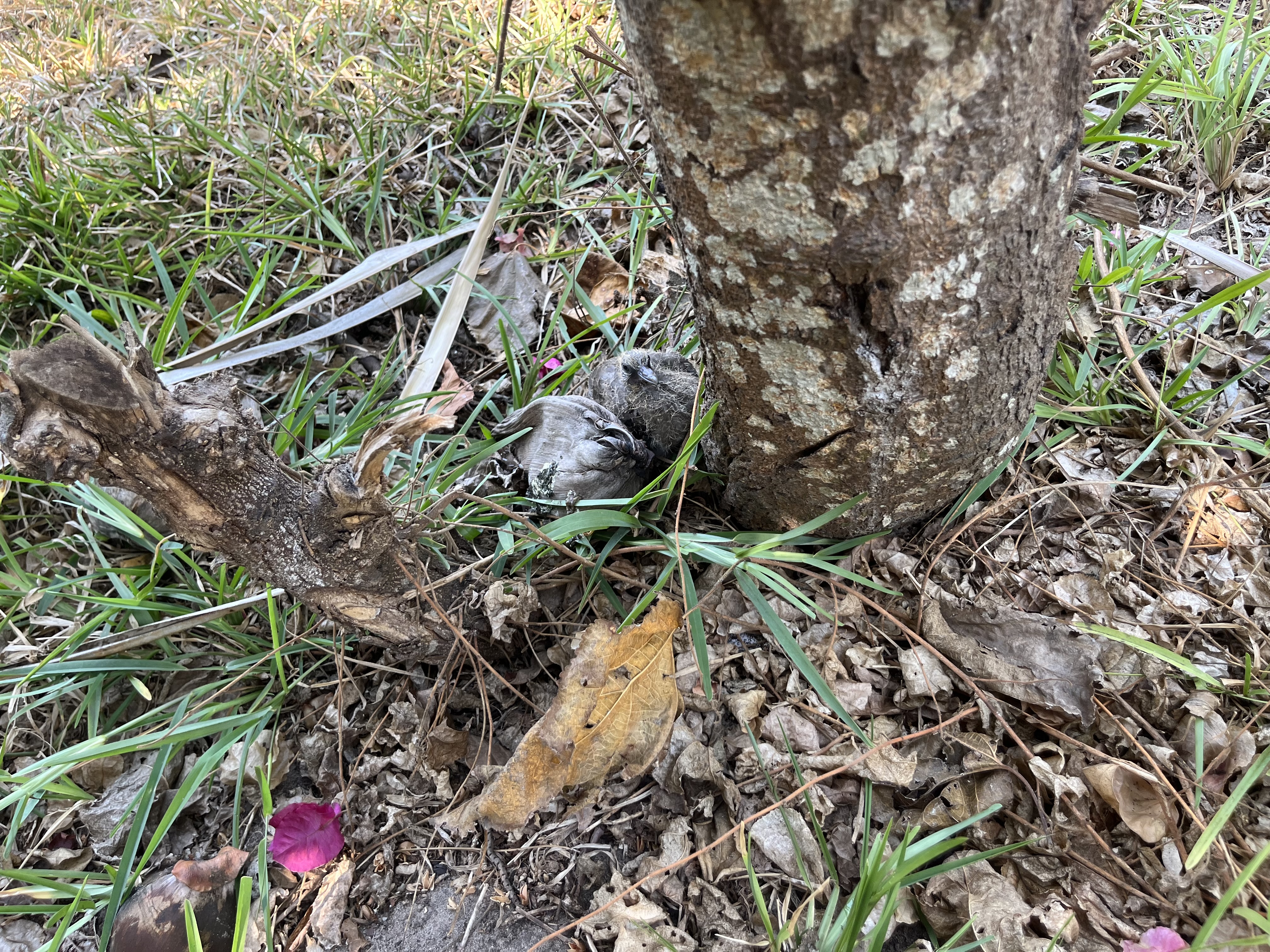I see a dove land and some small flapping wings next to it. The glimmer of hope is alive, and upon closer induction there Dorothy the chicken is. Sitting on the grass with mommy feeding her. The ugliest little dove, but a resilient one at that.