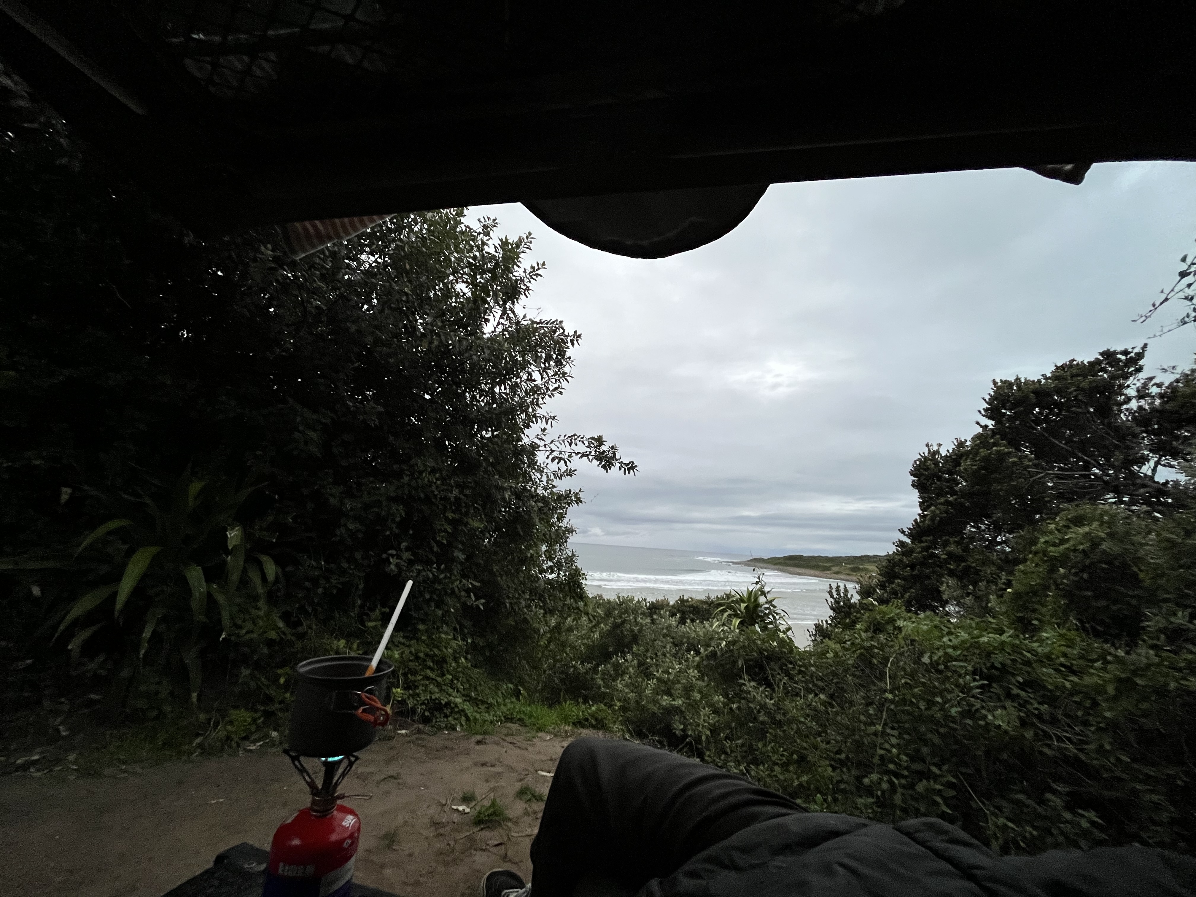 I wake up the the sound of the ocean and a light rain. I excitedly open up the back of the canopy and look out over the beautiful yellow sands mouth. There are fun little waves! It’s not enormous, just far more consistent than last night. Health-wise I’m feeling almost 100% again which is lovely.