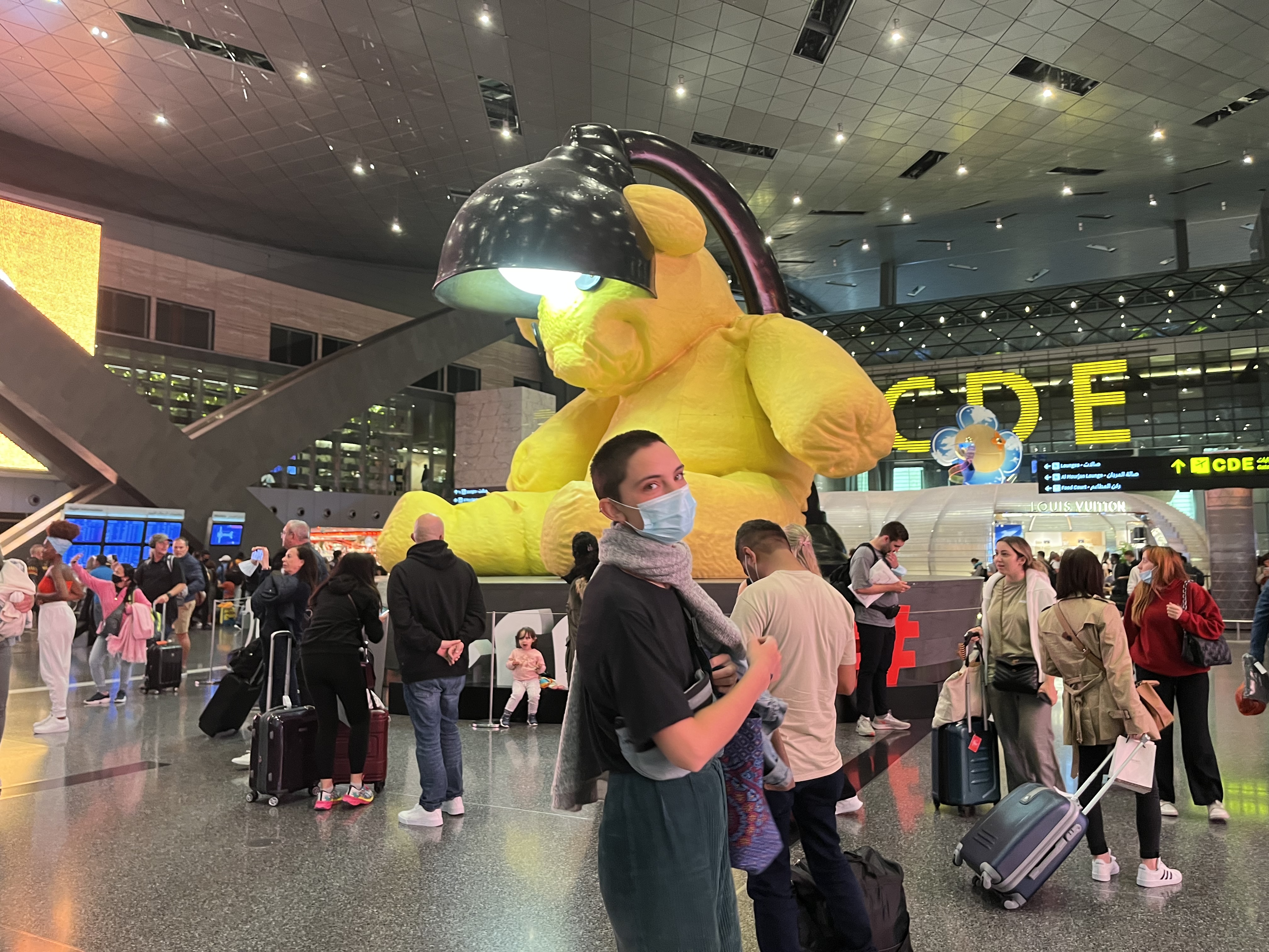 We arrive in Doha in the early morning. I haven’t managed to find much sleep but the casino-esque airport provides enough stimulation to keep us awake. We find ourselves walking through the busy airport terminals, looking at the expensive goods being sold (and bought) in duty free. A huge demented teddy bear merged with a lamp provides a landmark to help orientate ourselves.
