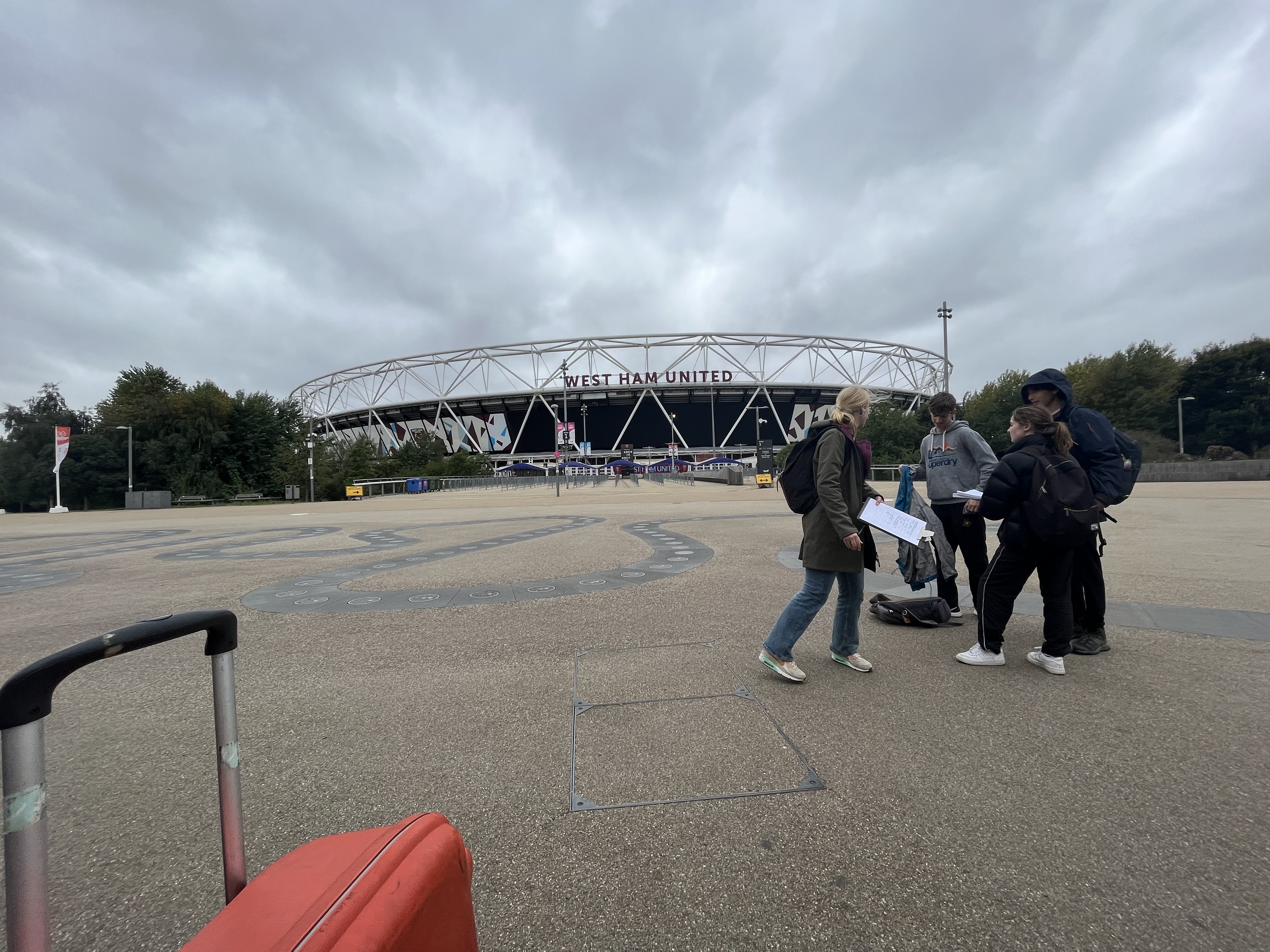 We hop onto another train and find a seat, this time more attention is paid to how tired we are. We get off at our station and begin to walk. Wheelie bags and backpacks make for fairly easy travel. I’m hungry and luckily we walk through a shopping mall where I can buy a sandwich. After a fifteen minute walk where enthusiasm is hindered by tiredness we find a bench looking at the West Ham United stadium where we eat and watch groups of school children performing some sort of treasure hunt.