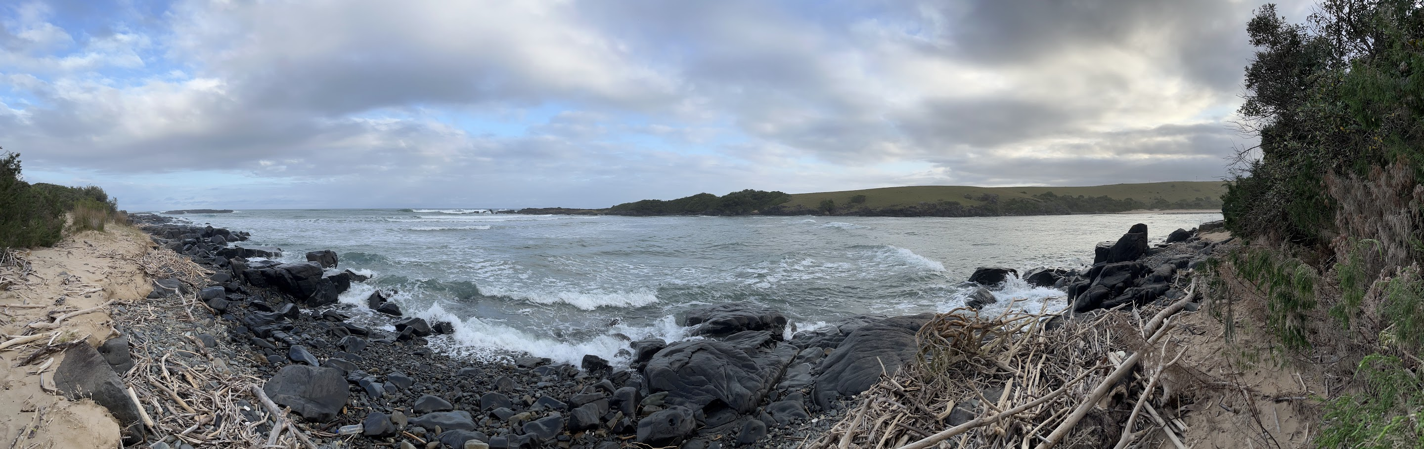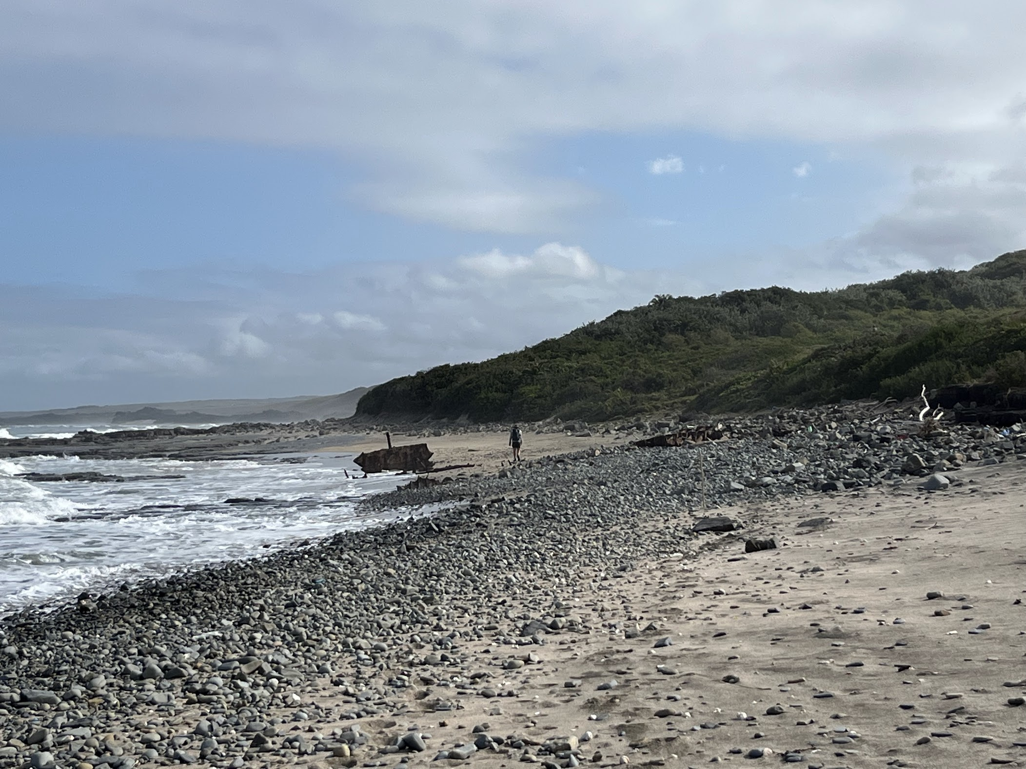 Then suddenly the hills are gone and the beach returns. Stones litter the beach - some very skim-able ones too. We find a shipwreck on the beach and investigate its rusted skeleton.