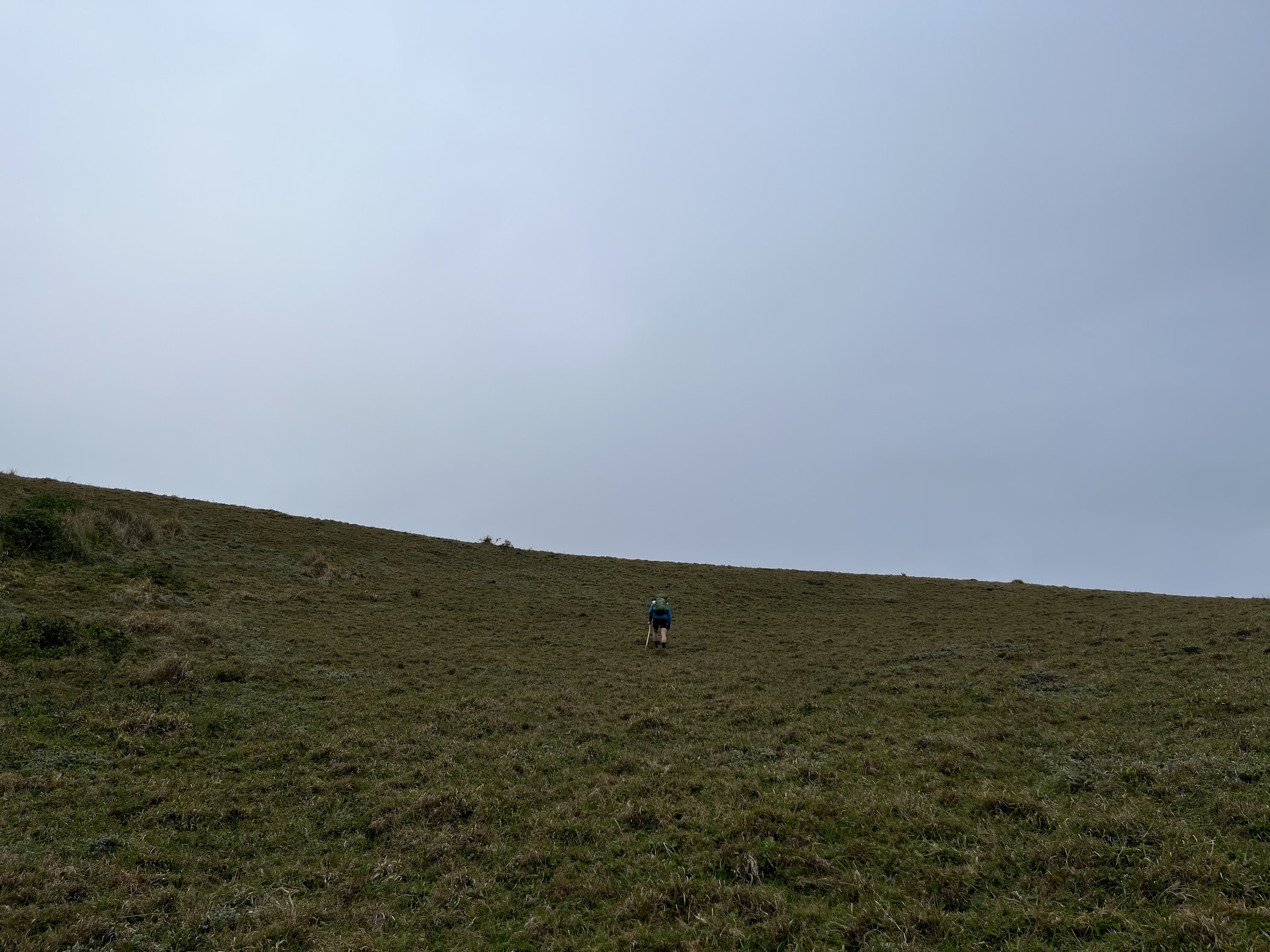 The beaches turn to grassy hills again. After almost two days of endless flat beaches weāre incredibly excited to see the land rising up above us. I find a good walking stick that helps ease the weight on the leg and I cruise up the hills ease.