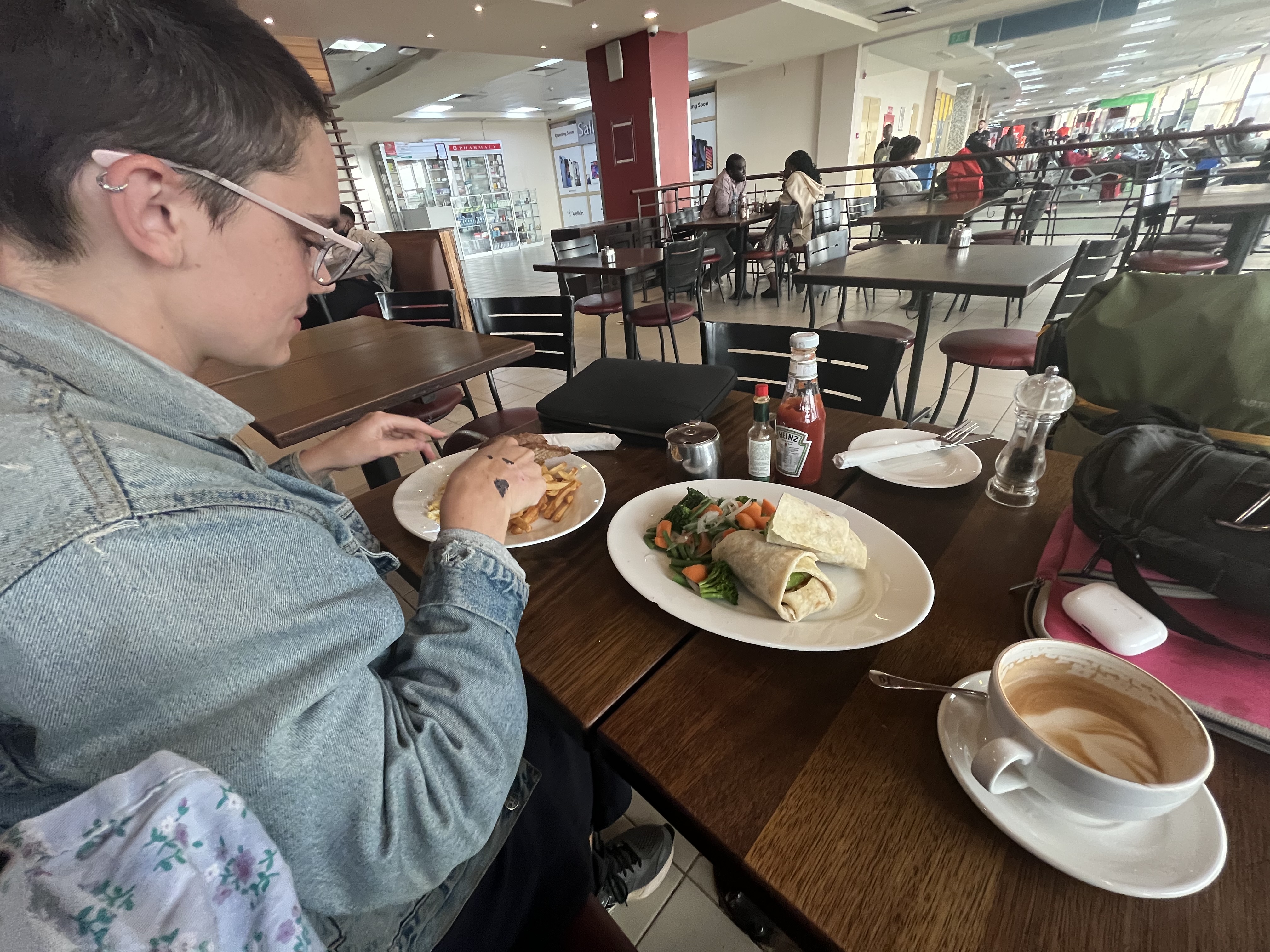 We find reclining chairs and get a couple more hours sleep. Coffee is calling - we sit down at a restaurant and I order a coffee and omelette that makes my morning.