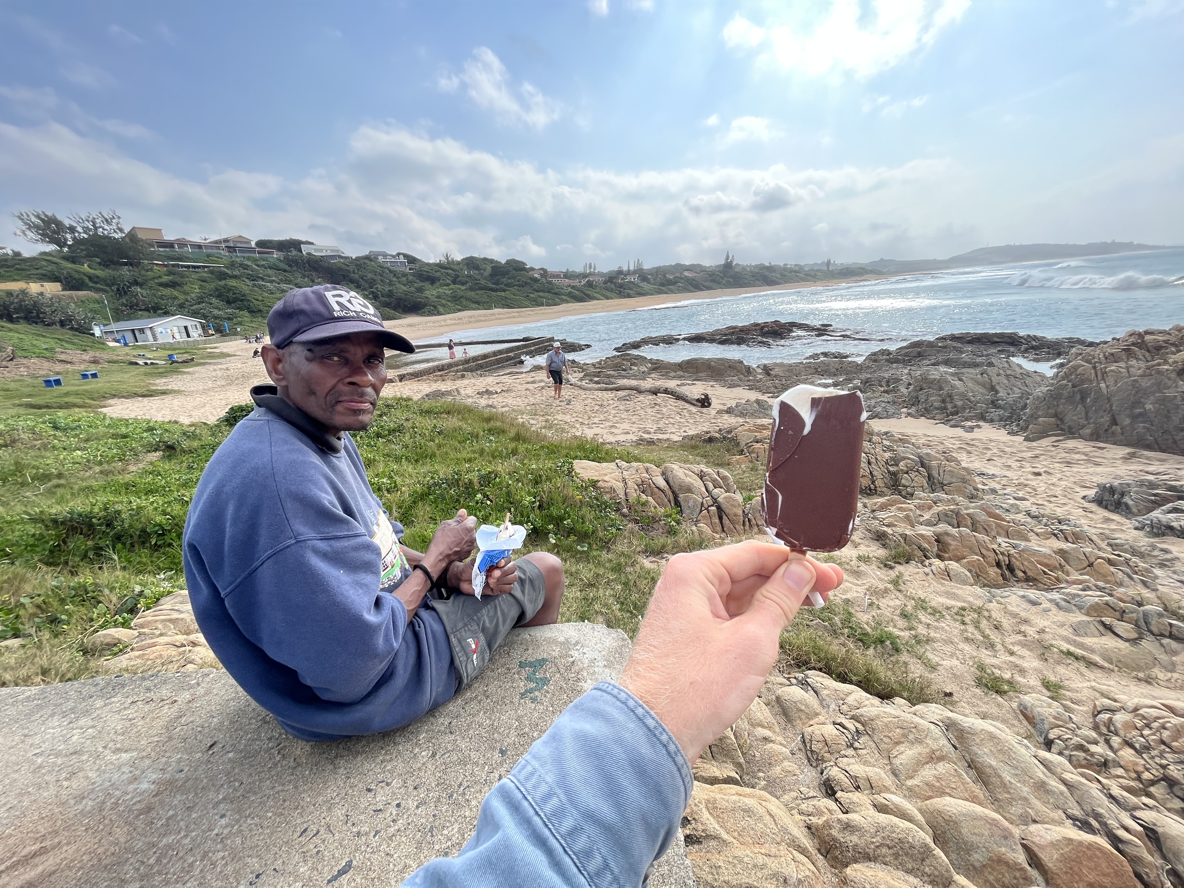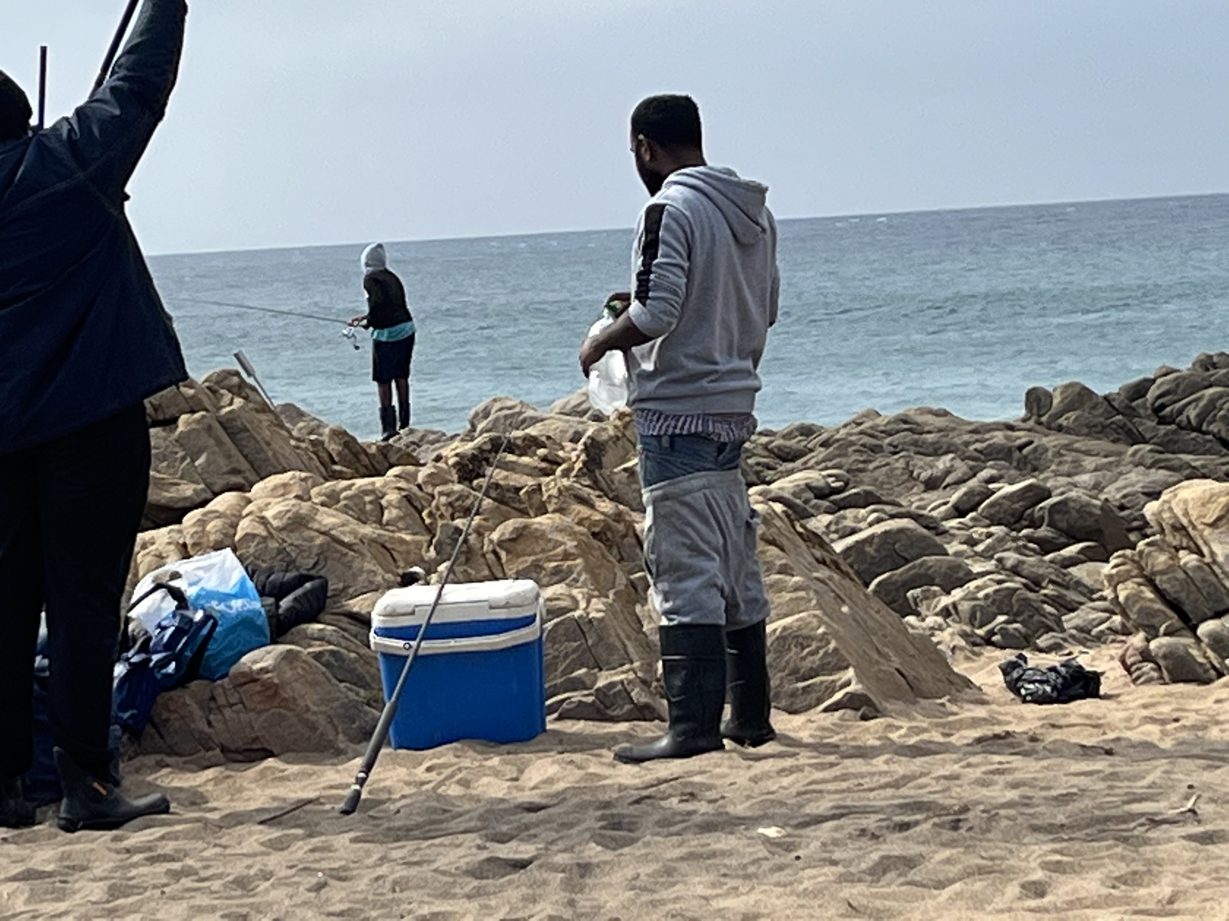 He is helping the fishermen out and he shows me the fish they have caught. The fishermen are from Durban and are not impressed that I don’t fish myself. One of them has low slung jeans over boxers with an even lower slung pair of tracksuit pants over the jeans.
